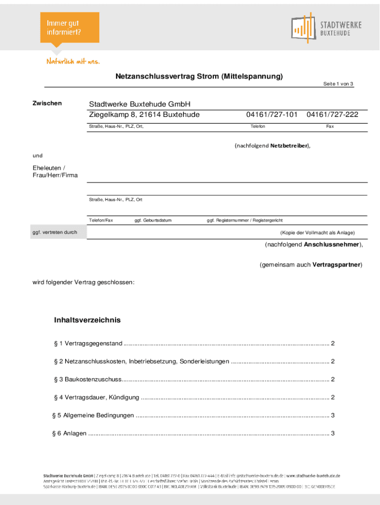 Netzanschlussvertrag Storm (Mittelspannung) Sate 1 on 3ZwischenStadtwerke Buxtehude GmbH Ziegelkamp 8, 21614 Buxtehude Straw, Haunt., PLY, ORT,04161/72710104161/727222TelefonFax(nachfolgend Netzbetreiber),