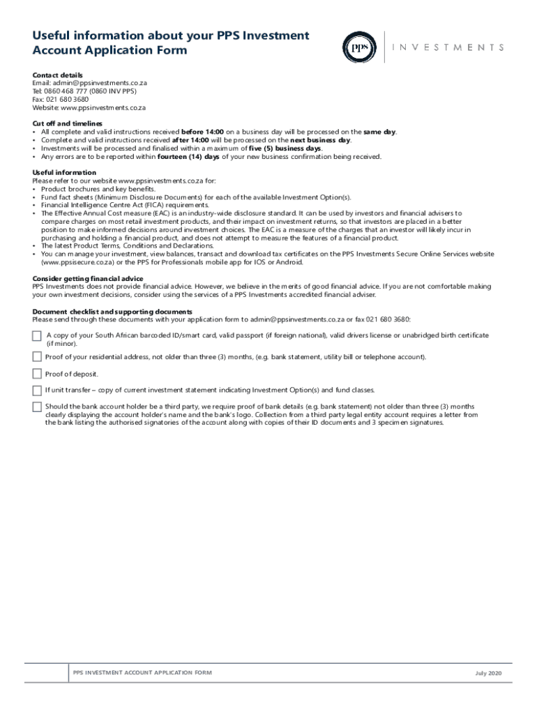 Useful information about your PPS Investment Account Application Form Contact details Email: admin@ppsinvestments.co.za Tel: 0860 468 777 (0860 IN PPS) Fax: 021 680 3680 Website: www.ppsinvestments.co.za
