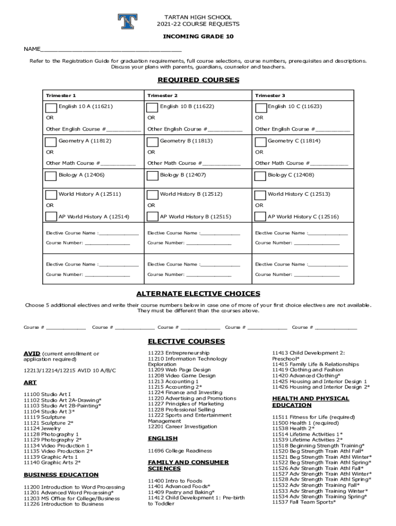 TARTAN HIGH SCHOOL 202122 COURSE REQUESTS INCOMING GRADE 10 NAME___ Refer to the Registration Guide for graduation requirements, full course selections, course numbers, prerequisites and descriptions.