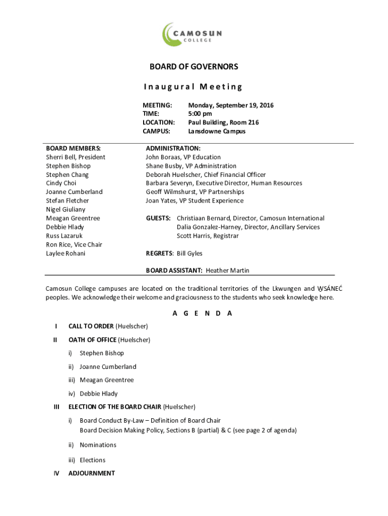 BOARD OF GOVERNORS Inaugural Meeting: TIME: LOCATION: CAMPUS: BOARD MEMBERS: Sherri Bell, President Stephen Bishop Stephen Chang Cindy Choir Joanne Cumberland Stefan Fletcher Nigel Giuliani Meagan