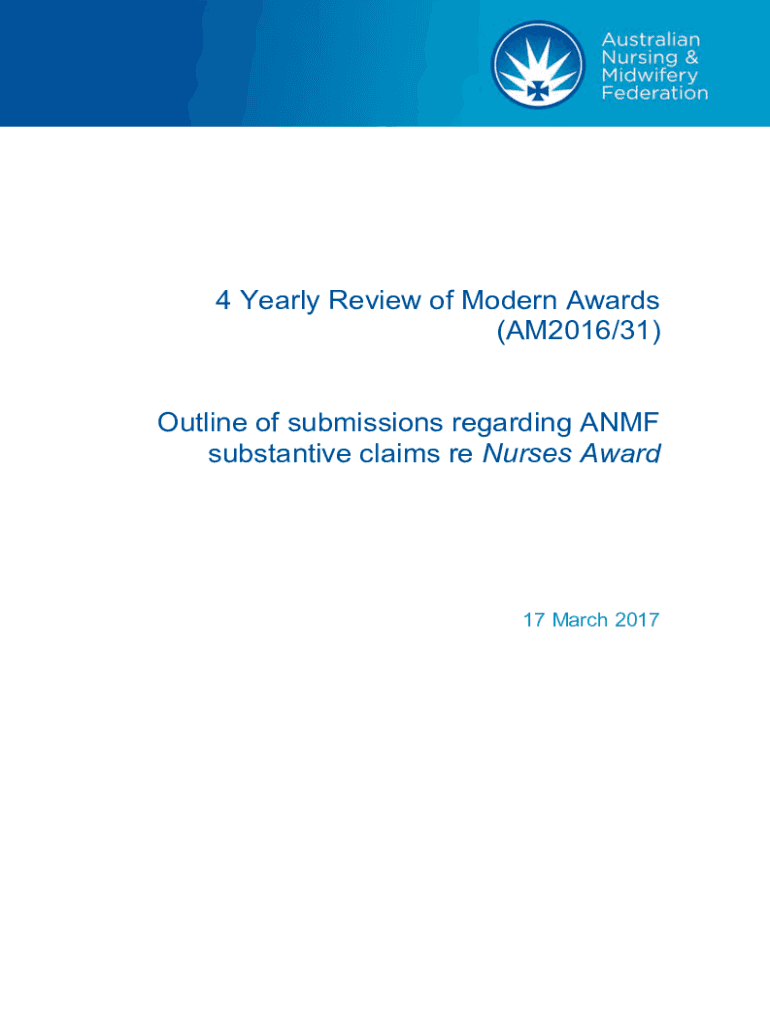 4 Yearly Review of Modern Awards (AM2016/31) Outline of submissions regarding AIMF substantive claims re Nurses Award17 March 2017Introduction 1. The Australian Nursing and Midwifery Federation (AIMF)