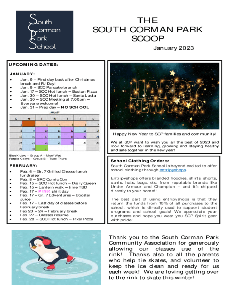 THE SOUTH NORMAN PARK SCOOP January 2023 UPCOMING DATES: JANUARY: Jan. 9 First day back after Christmas break and PJ Day! Jan. 9 SCC Pancake brunch Jan. 17 SCC Hot lunch Boston Pizza Jan. 30 SCC Hot