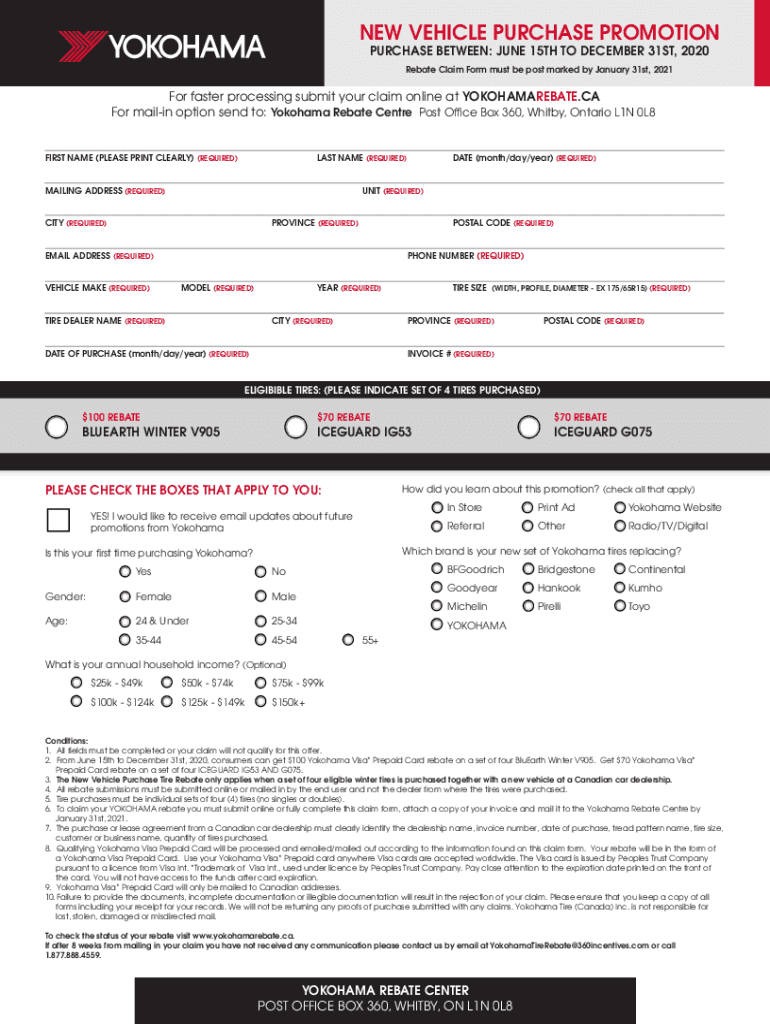 NEW VEHICLE PURCHASE PROMOTION PURCHASE BETWEEN: JUNE 15TH TO DECEMBER 31ST, 2020 Rebate Claim Form must be post marked by January 31st, 2021For faster processing submit your claim online at YOKOHAMAREBATE.CA
