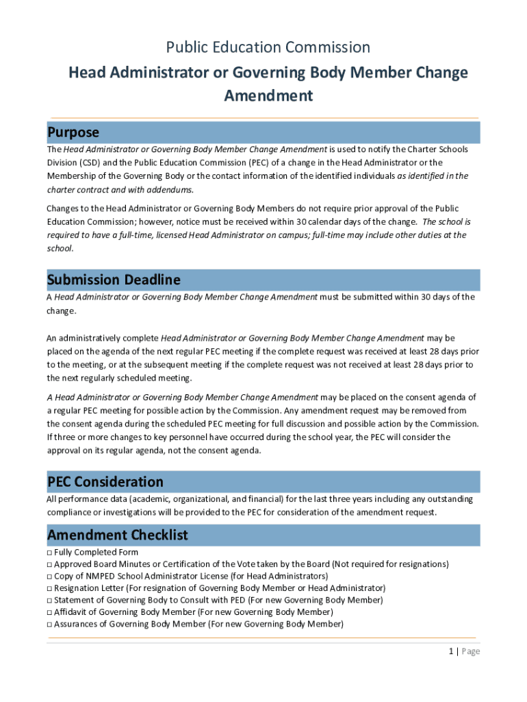 Public Education Commission Head Administrator or Governing Body Member Change Amendment Purpose The Head Administrator or Governing Body Member Change Amendment is used to notify the Charter Schools