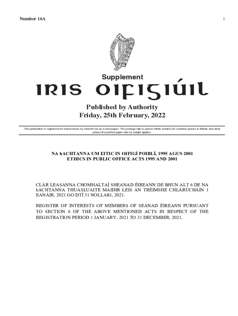 This publication is registered for transmission by Inland Post as a newspaper. The postage rate to places within Ireland (32