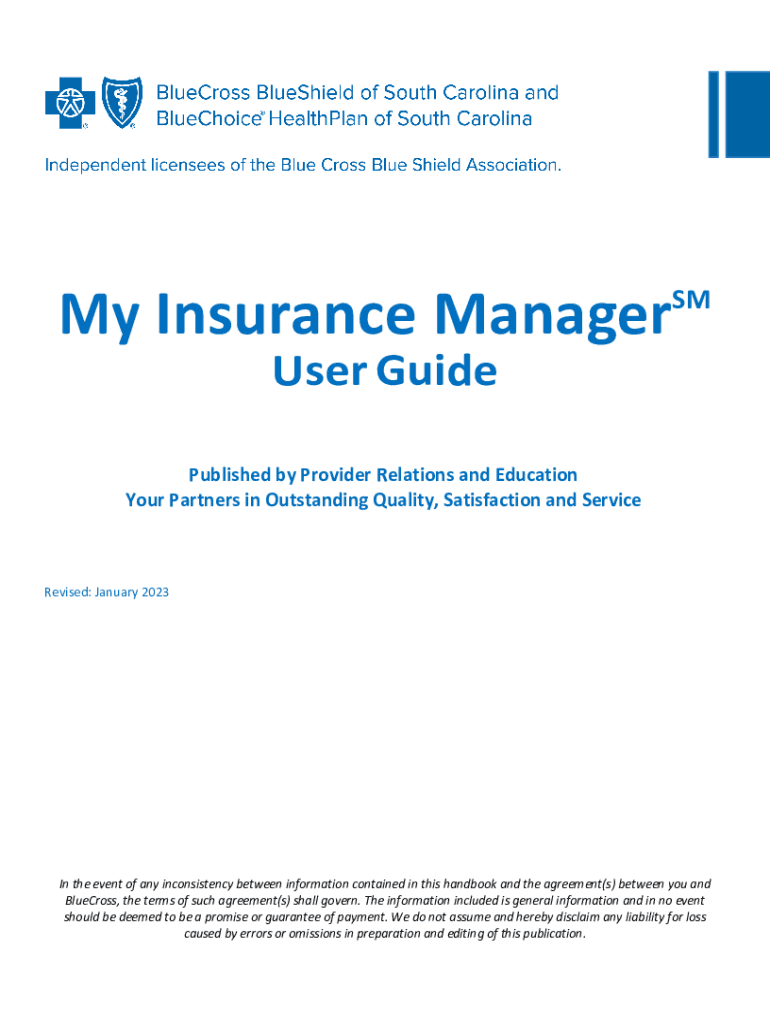 My Insurance ManagerSMUser GuidePublished by Provider Relations and Education Your Partners in Outstanding Quality, Satisfaction and ServiceRevised: January 2023In the event of any inconsistency between