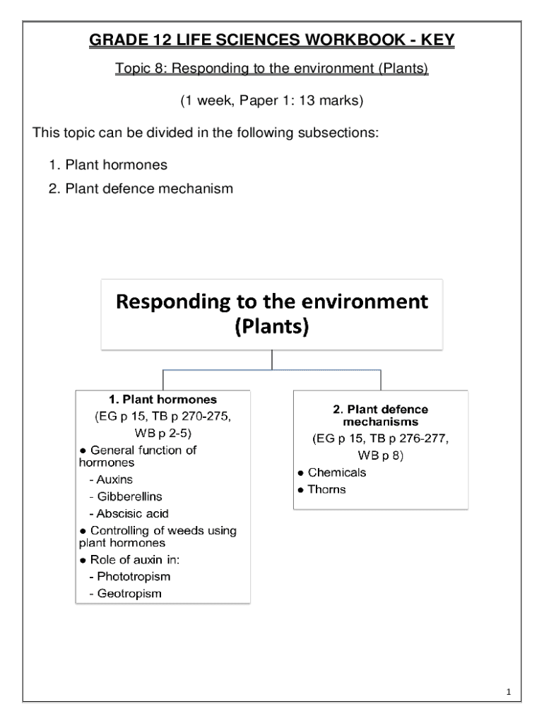 GRADE 12 LIFE SCIENCES WORKBOOK KEY Topic 8: Responding to the environment (Plants) (1 week, Paper 1: 13 marks) This topic can be divided in the following subsections: 1. Plant hormones 2. Plant defense