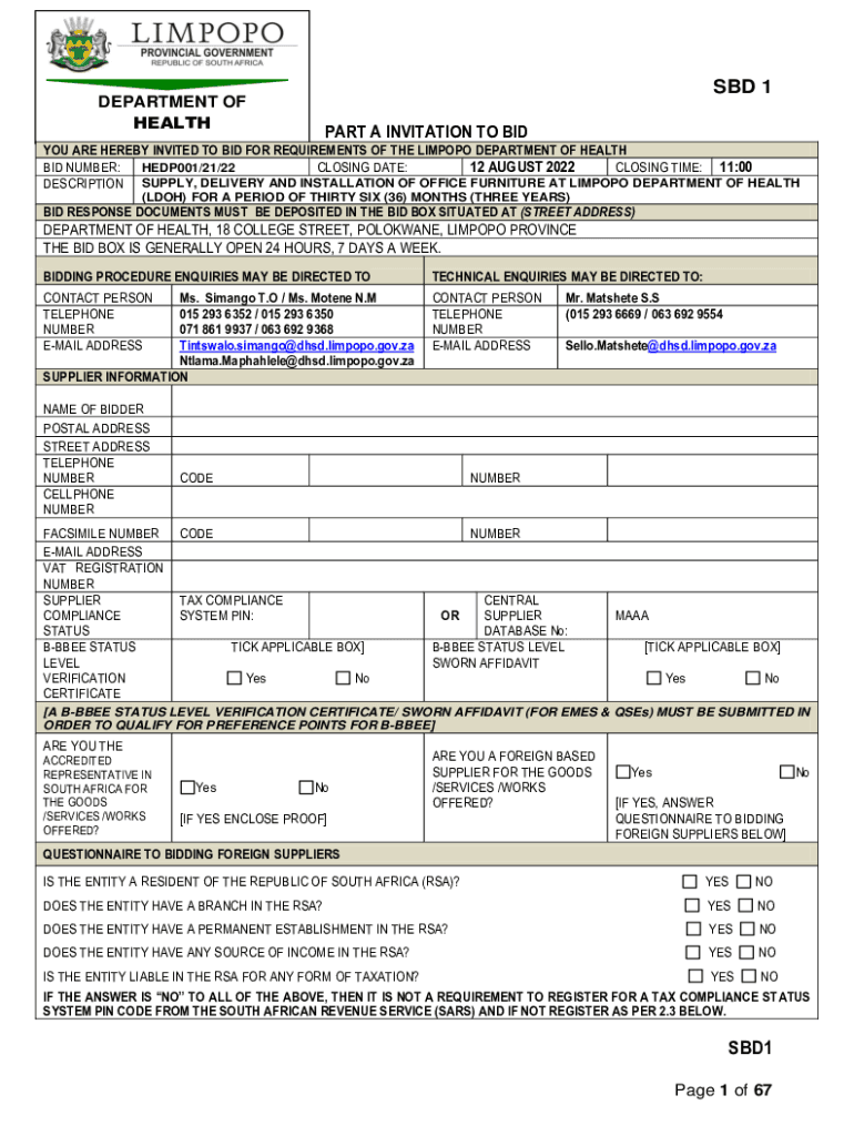 SBD 1DEPARTMENT OF HEALTHCARE A INVITATION TO BAYOU ARE HEREBY INVITED TO BID FOR REQUIREMENTS OF THE LIMPOPO DEPARTMENT OF HEALTH BID NUMBER: HEDP001/21/22 CLOSING DATE: 12 AUGUST 2022 CLOSING TIME: