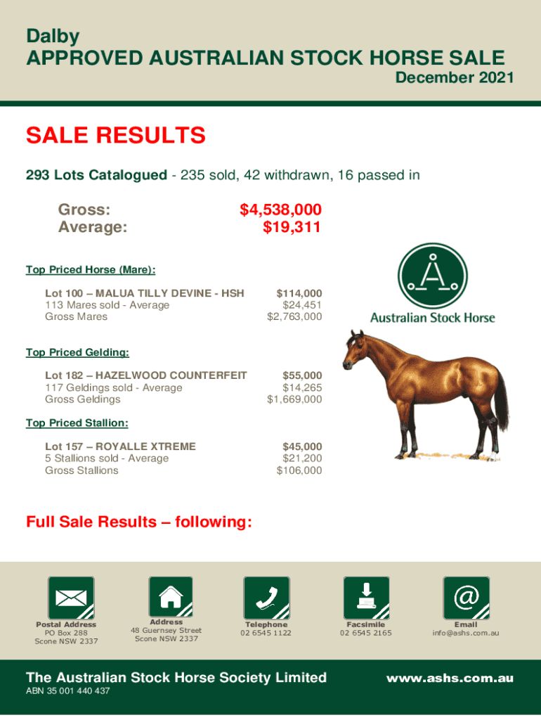 Daley APPROVED AUSTRALIAN STOCK HORSE SALE December 2021SALE RESULTS 293 Lots Cataloged 235 sold, 42 withdrawn, 16 passed ingress: Average:$$4,538,00019,311Top Priced Horse (Mare): Lot 100 MALTA TILLY