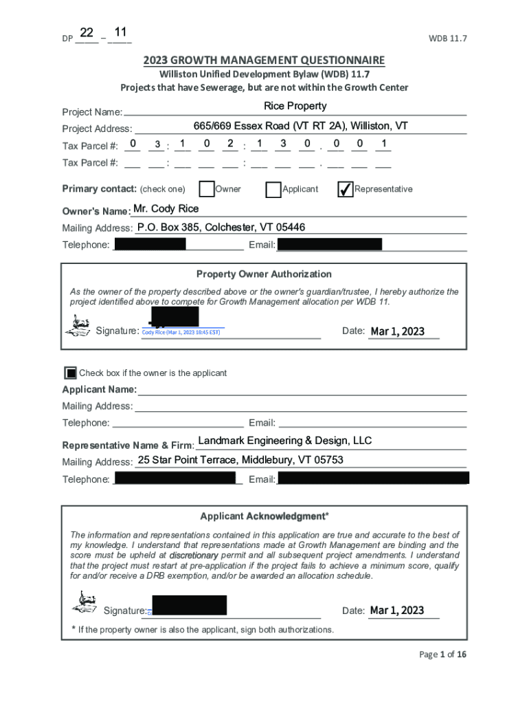 1122DP ___ ___WEB 11.7202 GROWTH MANAGEMENT QUESTIONNAIRE Williston Unified Development Bylaw (WEB) 11. Projects that have Sewerage, but are not within the Growth Center Rice PropertyProject Name: