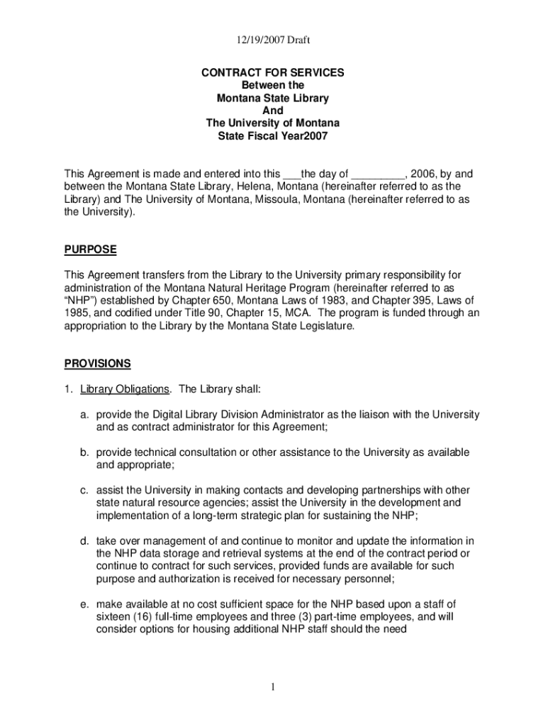 12/19/2007 Draft CONTRACT FOR SERVICES Between the Montana State Library And The University of Montana State Fiscal Year2007This Agreement is made and entered into this ___the day of ___, 2006, by