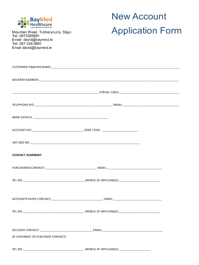 Email david@baymed.ieApplication FormCUSTOMER TRADING NAME:___DELIVERY ADDRESS:______ POSTAL