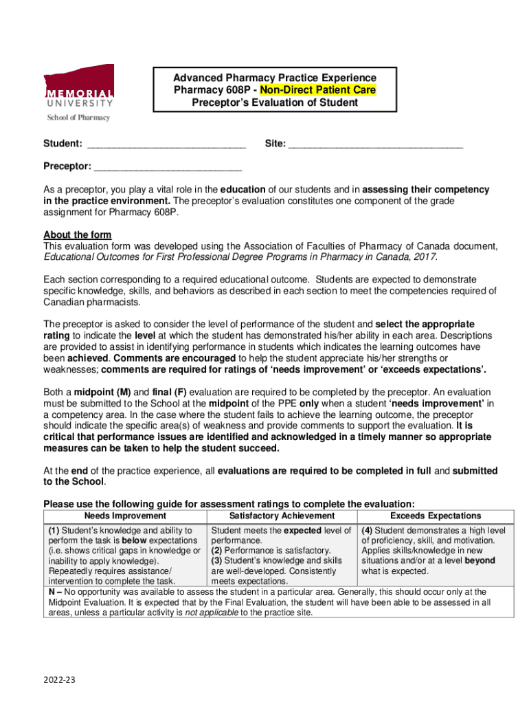 Advanced Pharmacy Practice Experience Pharmacy 608P Indirect Patient Care Preceptors Evaluation of Student School of PharmacyStudent: ___Site: ___Preceptor: ___ As a preceptor, you play a vital role