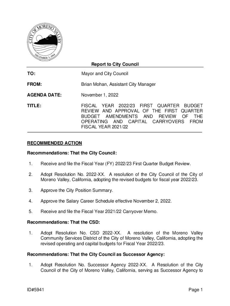 Report to City Council TO:Mayor and City Councilor:Brian Moran, Assistant City ManagerAGENDA DATE:November 1, 2022TITLE:FISCAL YEAR 2022/23 FIRST QUARTER BUDGET REVIEW AND APPROVAL OF THE FIRST QUARTER