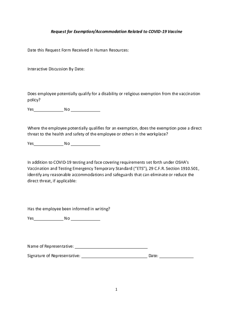 Request for Exemption/Accommodation Related to COVID-19 Vaccinate this Request Form Received in Human Resources:Interactive Discussion By Date:Does employee potentially qualify for a disability or