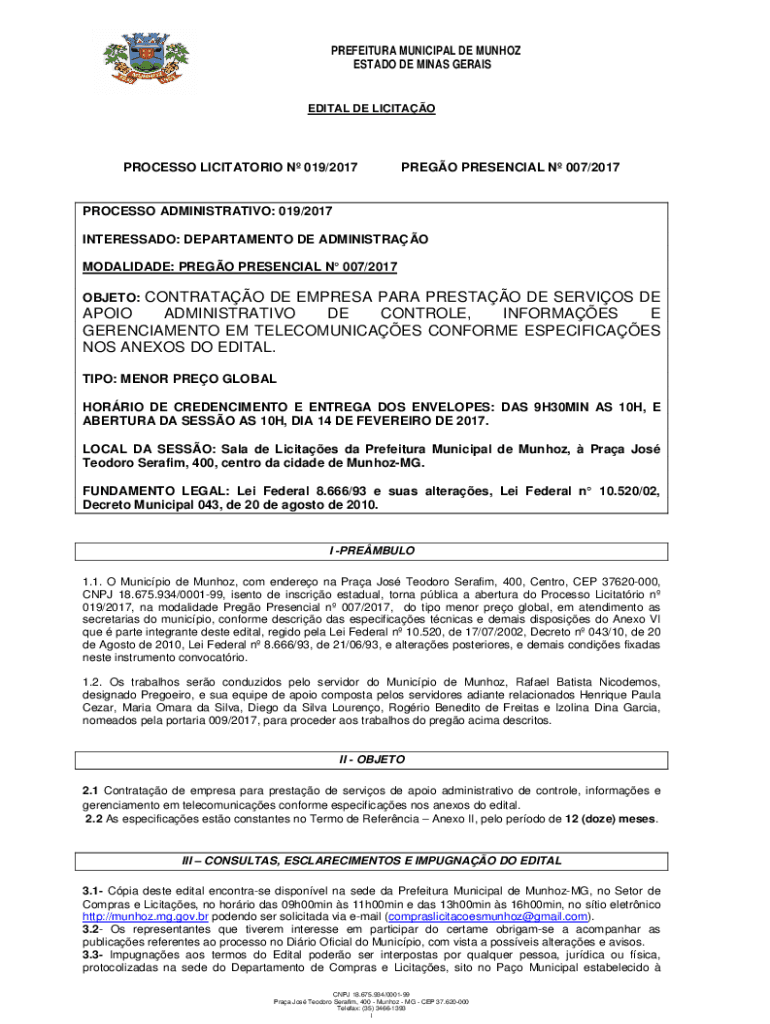 ESTATE DE MINES GERAISEDITAL DE LICITAOPROCESSO LICITATORIO N 019/2017PREGO PRESENCE N 007/2017PROCESSO ADMINISTRATIVE: 019/2017