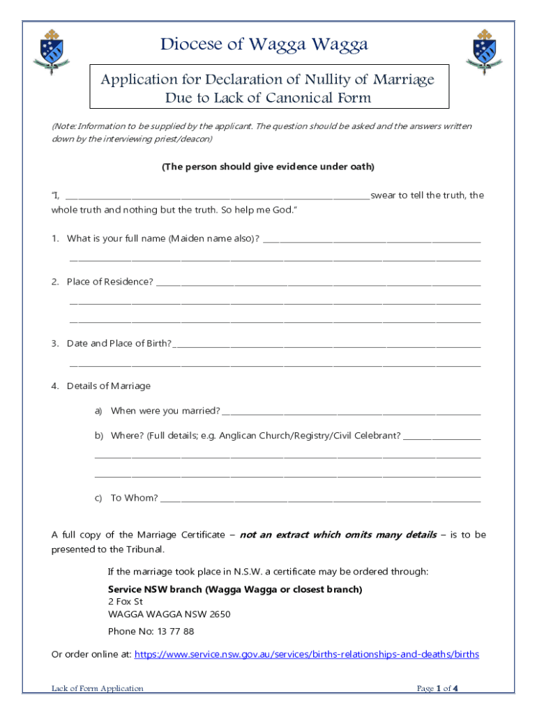 Diocese of Wagga Wagga Application for Declaration of Nullity of Marriage Due to Lack of Canonical Form (Note: Information to be supplied by the applicant. The question should be asked and the answers