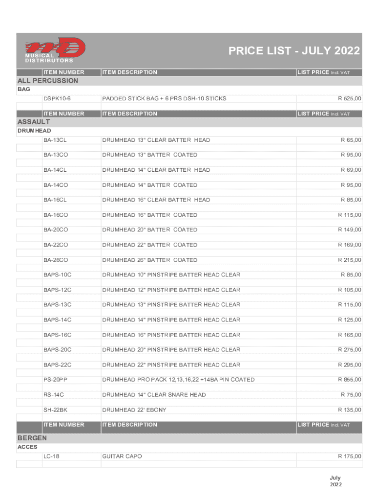 ITEM NUMBERED DESCRIPTIONS PRICE Incl. VAT ALL PERCUSSION