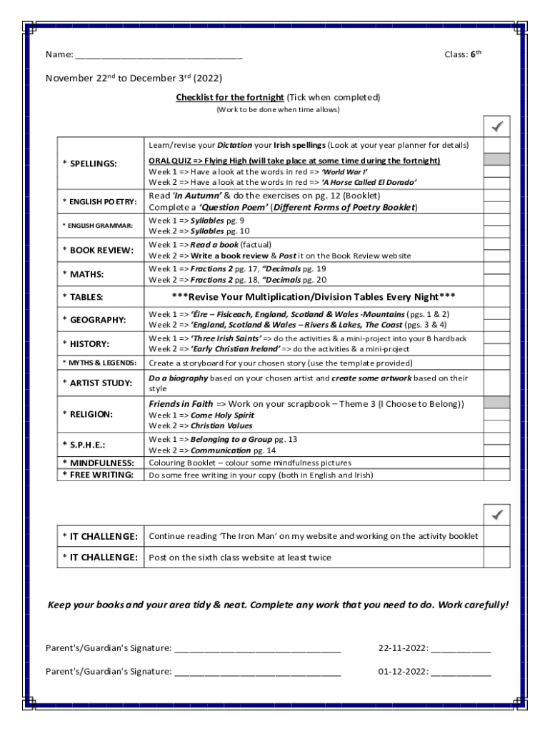 Class: 6thName: ___November 22nd to December 3rd (2022) Checklist for the fortnight (Tick when completed) (Work to be done when time allows)Learn/revise your Dictation your Irish spellings (Look at