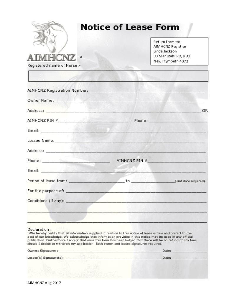 Notice of Lease Form Return form to: AIMING Registrar Linda Jackson 93 Manual RD, RD2 New Plymouth 4372Registered name of Horse:AIMING Registration Number:___ Owner Name:___ Address: ___ OR AIMING