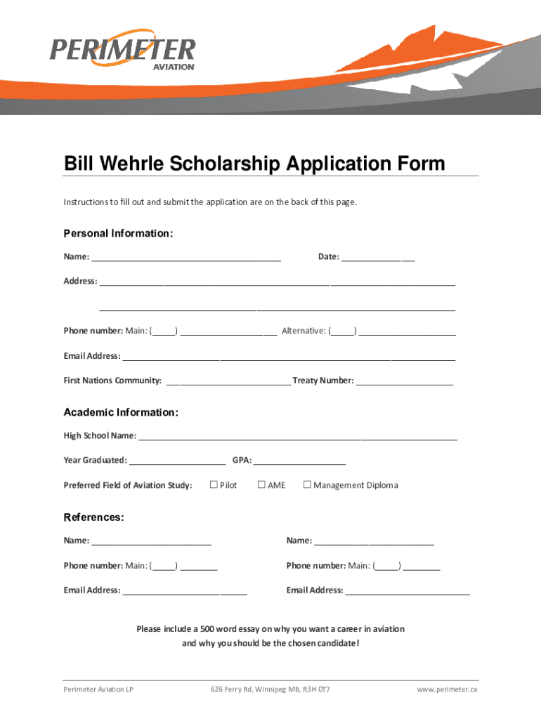 The Bill Wehrle Scholarship application is a formal request for financial assistance offered to students pursuing education, typically awarded based on specific criteria such as academic merit, financial need, or community involvement.