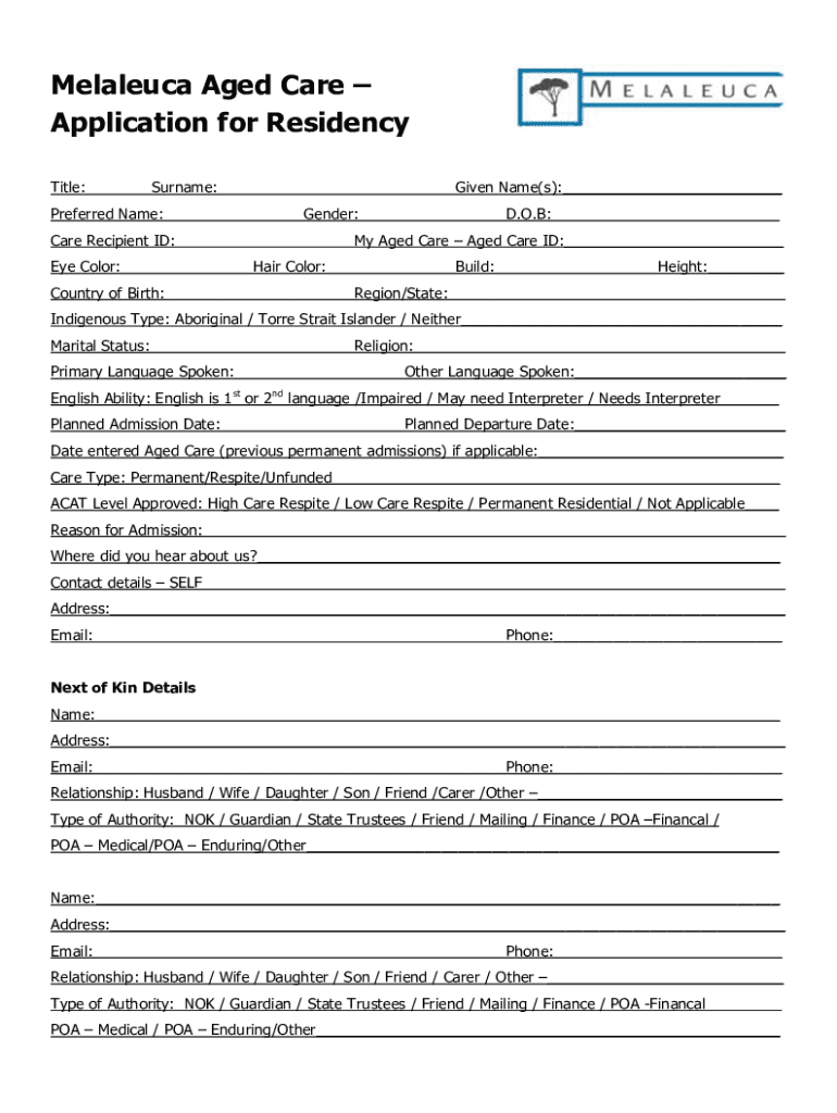 Metallica Aged Care Application for Residency Title:Surname:Given Name(s):___Preferred Name:Gender:Care Recipient ID:D.O.B:___My Aged Care ID:___Eye Color:Hair Color:Country of Birth:Build:Height:___Region/State:___Indigenous