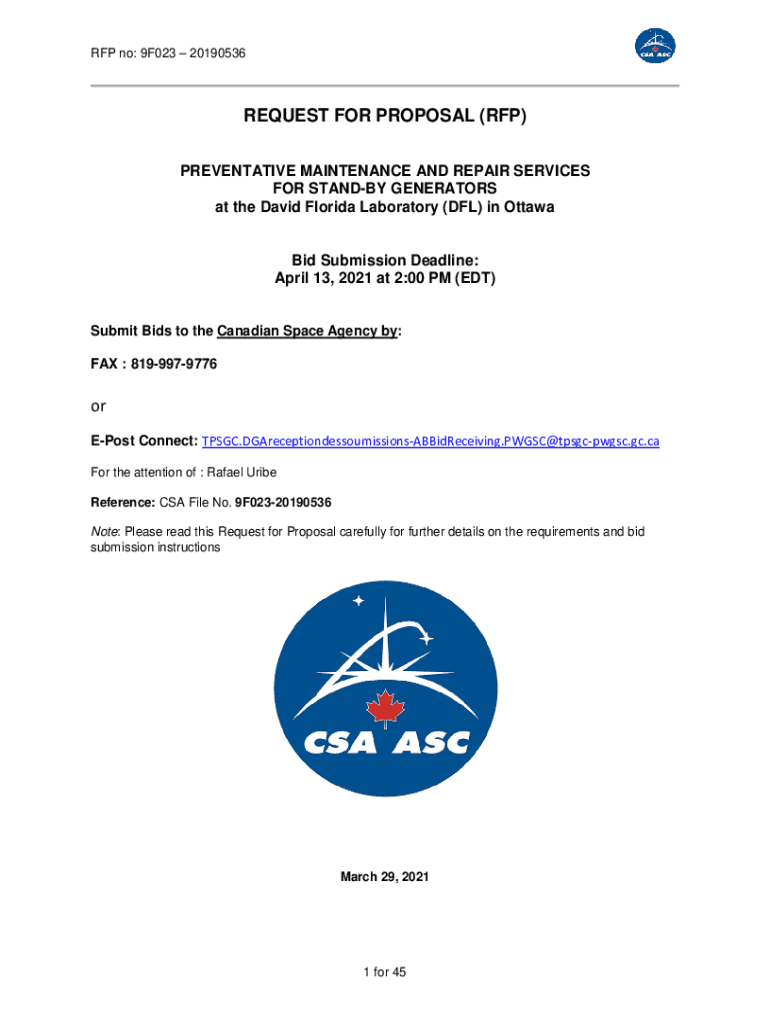 RFP no: 9F023 20190536REQUEST FOR PROPOSAL (RFP) PREVENTATIVE MAINTENANCE AND REPAIR SERVICES FOR STANDBY GENERATORS at the David Florida Laboratory (DFL) in Ottawa Submission Deadline: April 13,