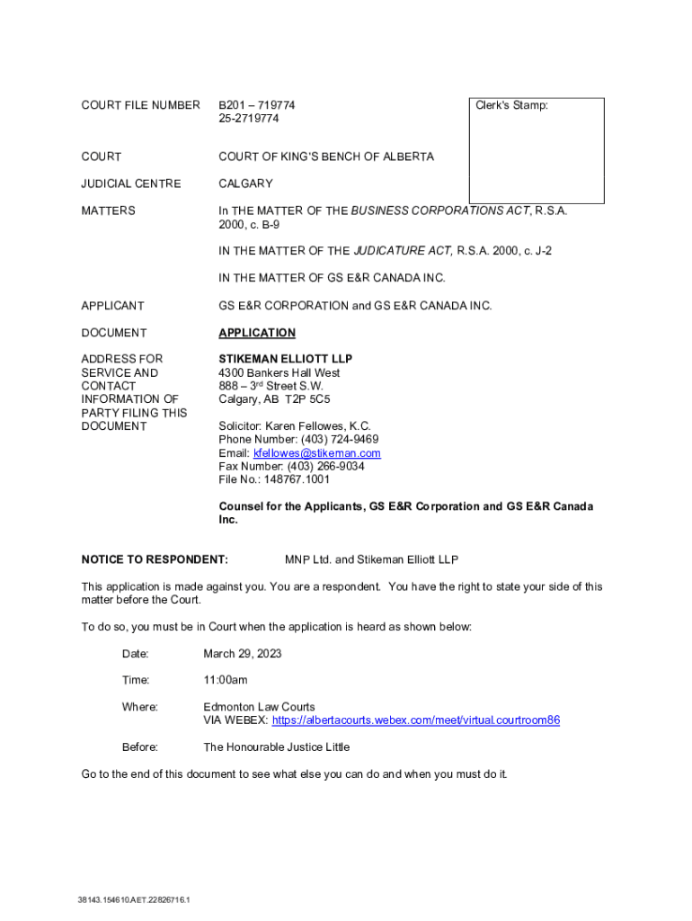 COURT FILE NUMBERB201 719774 252719774Clerk\'s Stamp:COURTHOUSE OF KING\'S BENCH OF ALBERTAJUDICIAL CENTRECALGARYMATTERSIn THE MATTER OF THE BUSINESS CORPORATIONS ACT, R.S.A. 2000, c. B9 IN THE MATTER