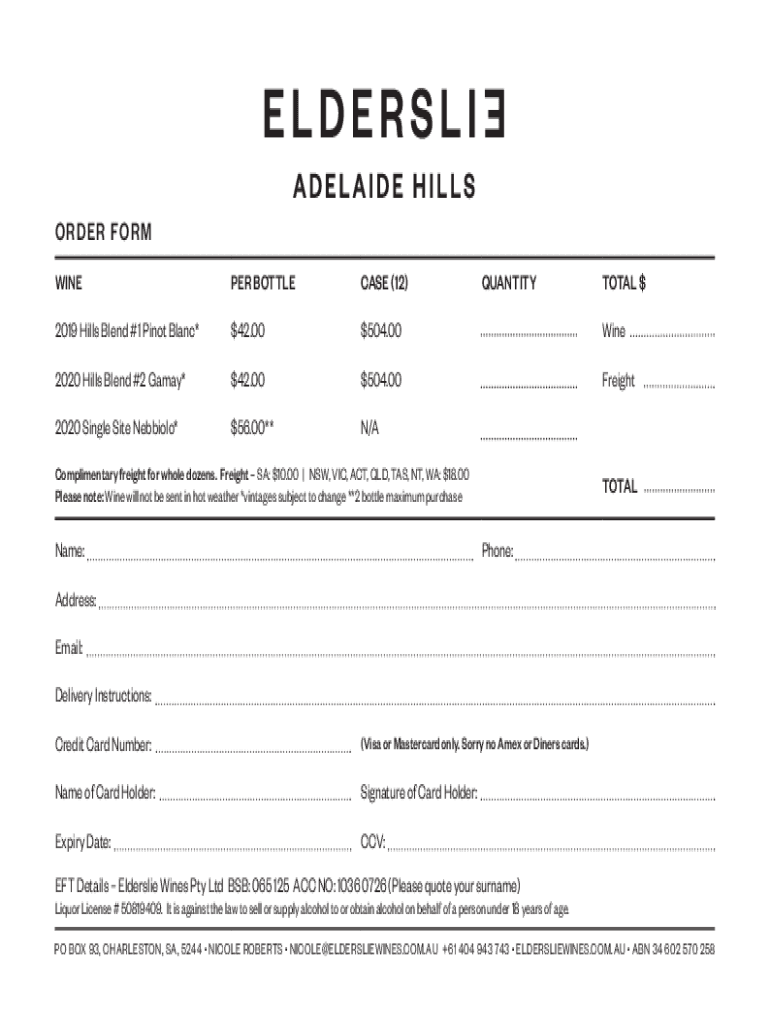 WINE PER BOTTLE CASE (12)QUANTITY2019 Hills Blend #1 Pilot Blanc*$$42.00504.00Wine2020 Hills Blend #2 Gamay*$$42.00504.00Freight2020 Single Site Nebbiolo*$56.00**N/Complimentary freight