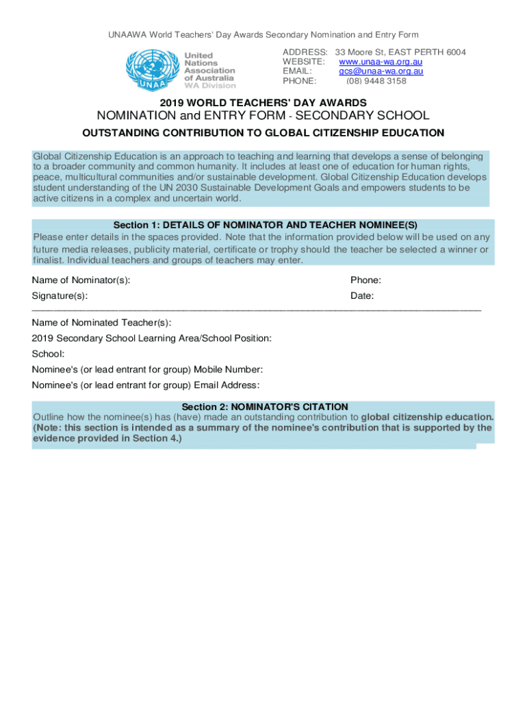 UNRWA World Teachers\' Day Awards Secondary Nomination and Entry Form ADDRESS: 33 Moore St, EAST PERTH 6004 WEBSITE: www.unaawa.org.au EMAIL: gcs@unaawa.org.au PHONE: (08) 9448 31582019 WORLD TEACHERS\'