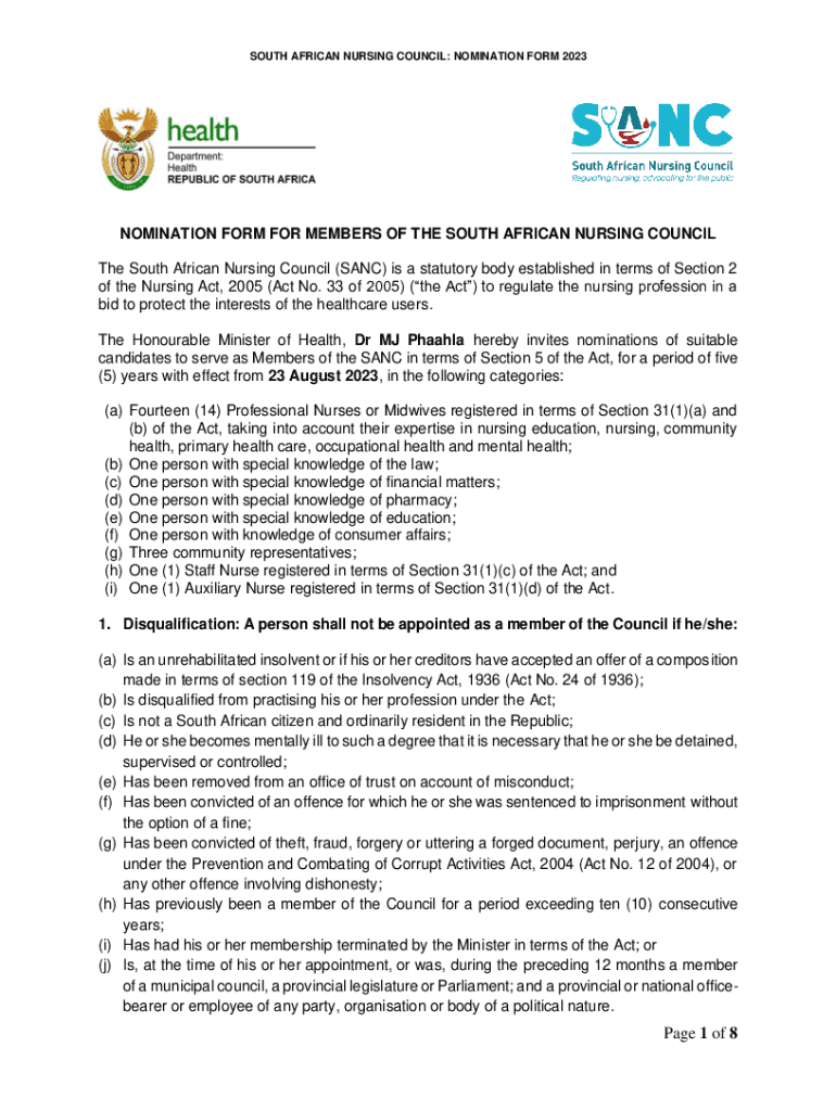 SOUTH AFRICAN NURSING COUNCIL: NOMINATION FORM 2023NOMINATION FORM FOR MEMBERS OF THE SOUTH AFRICAN NURSING COUNCIL The South African Nursing Council (SAN) is a statutory body established in terms