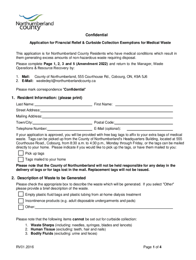Confidential Application for Financial Relief & Curbside Collection Exemptions for Medical Waste This application is for Northumberland County Residents who have medical conditions which result in