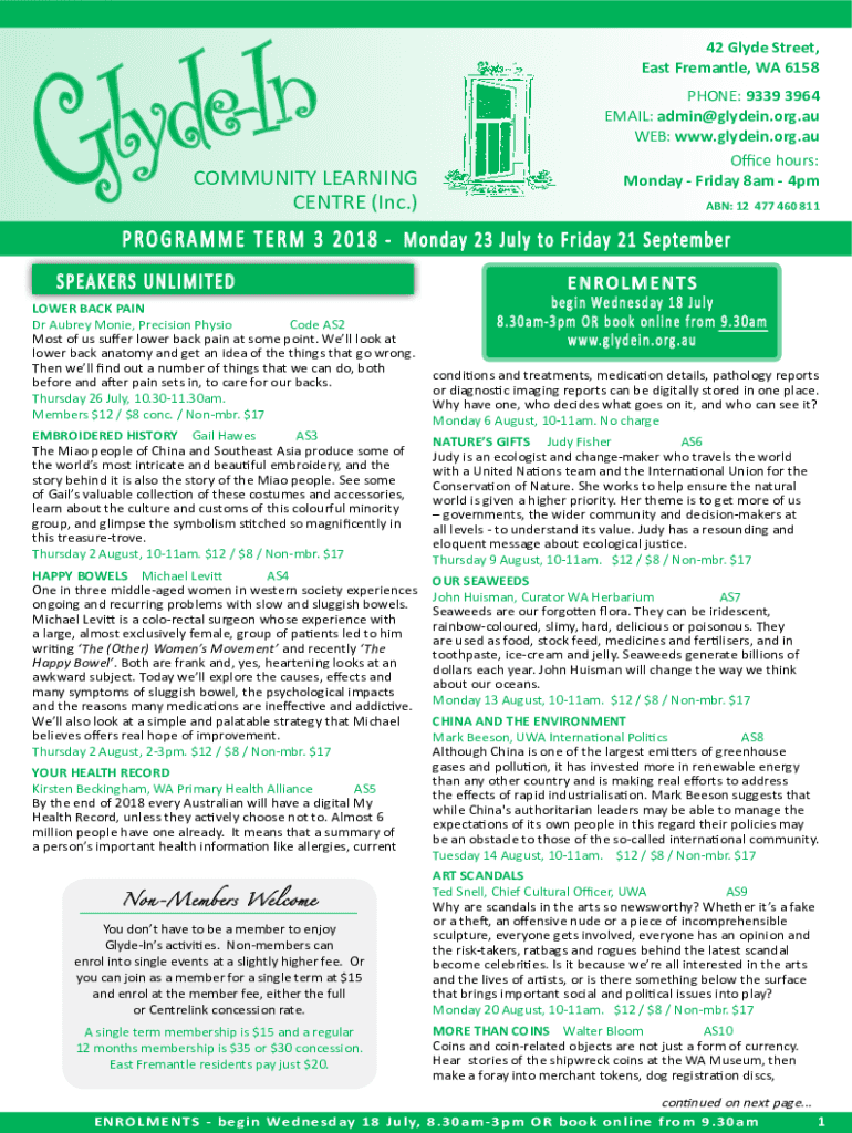 42 Clyde Street, East Fremantle, WA 6158COMMUNITY LEARNING Center (Inc.)PHONE: 9339 3964 EMAIL: admin@glydein.org.au WEB: www.glydein.org.au Office hours: Monday Friday 8am 4pm ABN: 12 477 460 811P
