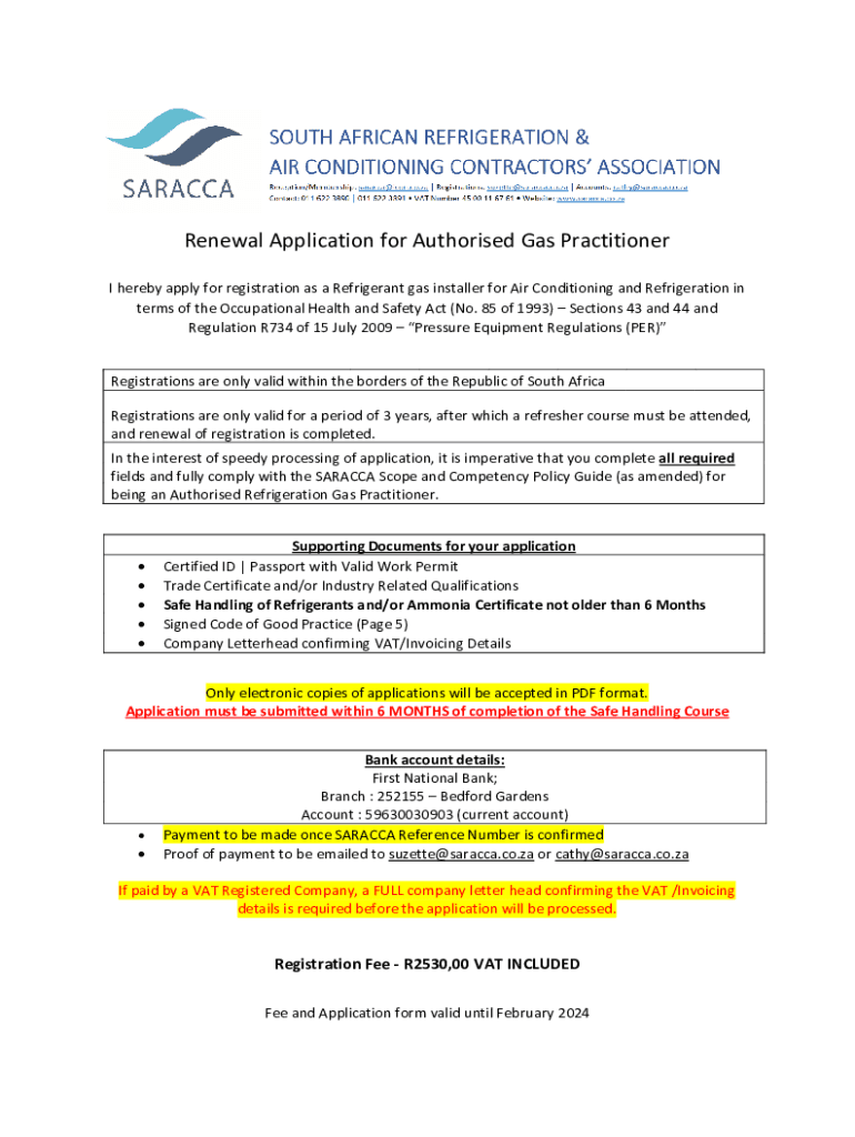 Renewal Application for Authorized Gas Practitioner I hereby apply for registration as a Refrigerant gas installer for Air Conditioning and Refrigeration in terms of the Occupational Health and Safety