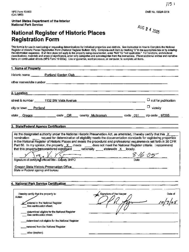 NPS Form 10900 (Oct1990)OMB No. 100240018United States Department of the Interior National Park Service24 2005National Register of Historic Places Registration Forms form is for use in nominating