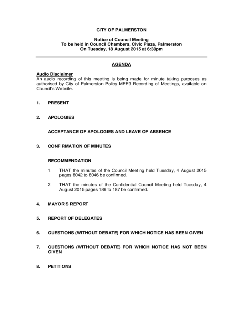 CITY OF PALMERSTON Notice of Council Meeting To be held in Council Chambers, Civic Plaza, Palmerston On Tuesday, 18 August 2015 at 6:30pmAGENDA Audio Disclaimer An audio recording of this meeting