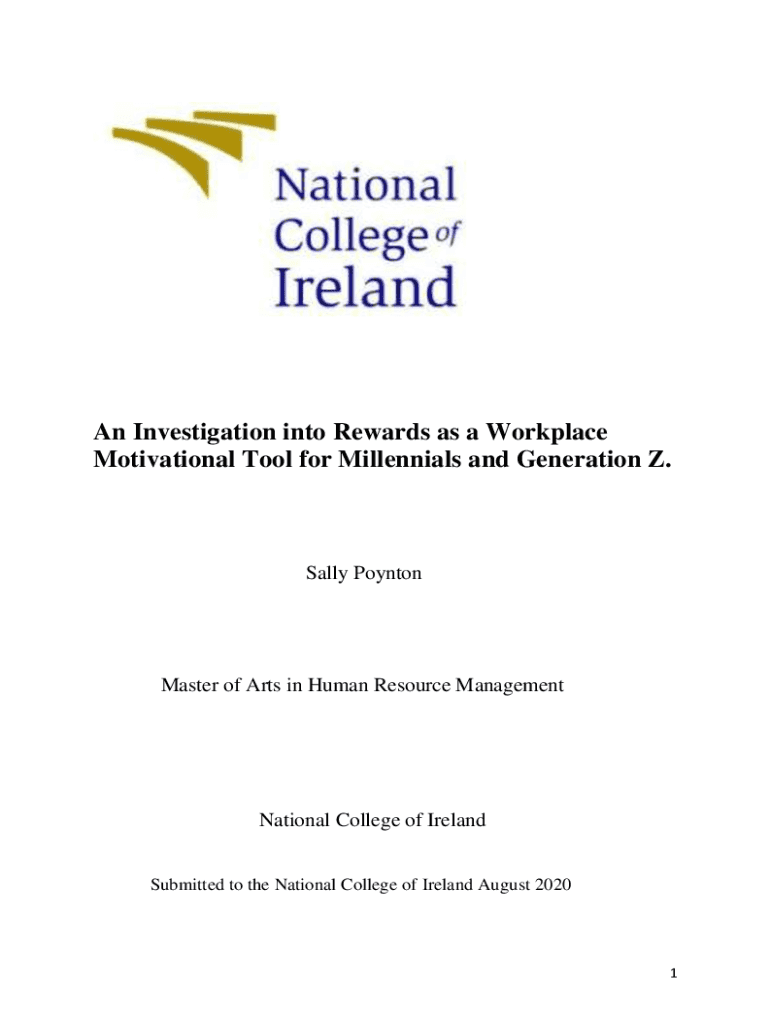 An Investigation into Rewards as a Workplace Motivational Tool for Millennials and Generation Z. Sally PoyntonMaster of Arts in Human Resource ManagementNational College of Ireland Submitted to the