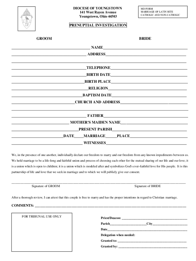 DIOCESE OF YOUNGSTOWN 141 West Raven Avenue Youngstown, Ohio 44503MD FORM MARRIAGE OF LATIN RITE CATHOLIC AND NONCATHOLICPRENUPTIAL INVESTIGATION GROOMBRIDE___ NAME___ ___ ADDRESS___ ___ ___TELEPHONE___