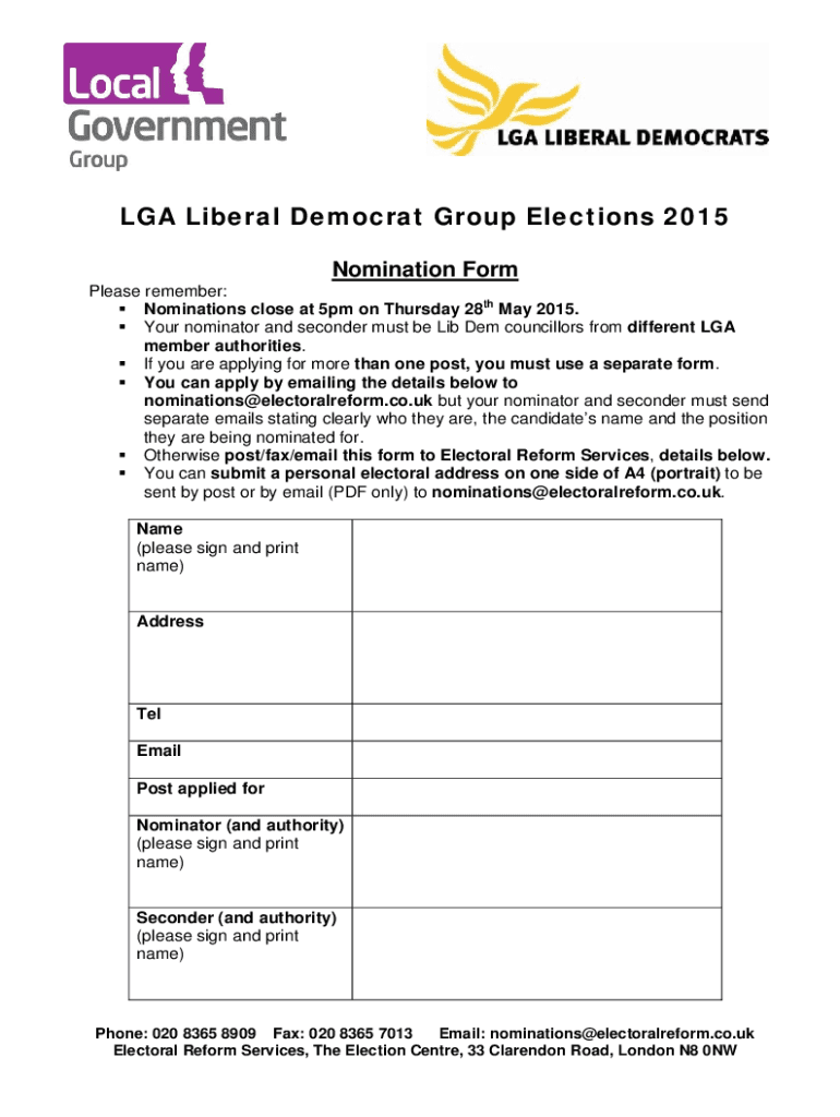 LGA Liberal Democrat Group Elections 2015 Nomination Form Please remember: Nominations close at 5pm on Thursday 28th May 2015. Your nominator and seconder must be Lib Dem councillors from different