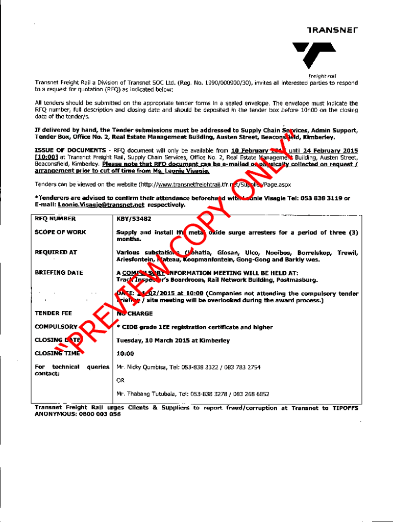 1RANSNErfreight rail Transnet Freight Rail a Division of Transnet SOC Ltd. (Reg. No. 1990/000900/30), to a request for quotation (RFQ) as indicated below:invites all interested parties to responded