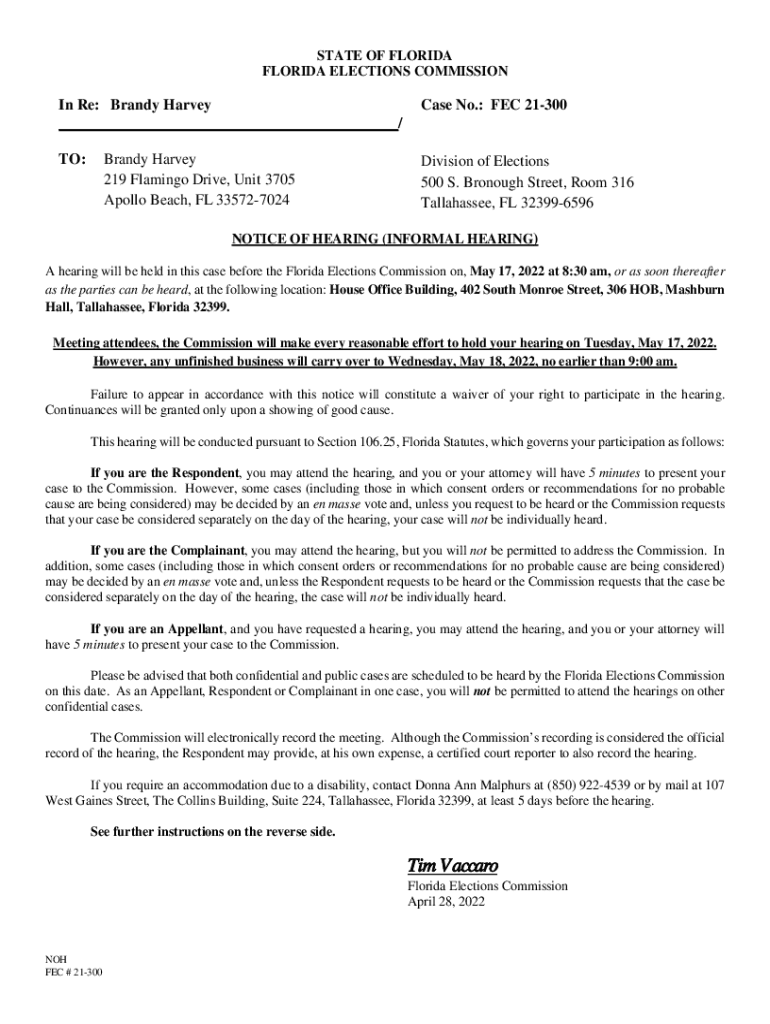 STATE OF FLORIDA ELECTIONS Commissioning Re: Brandy Harvey ___/Case No.: FEC 21300TO:Division of Elections 500 S. Borough Street, Room 316 Tallahassee, FL 323996596Brandy Harvey 219 Flamingo Drive,