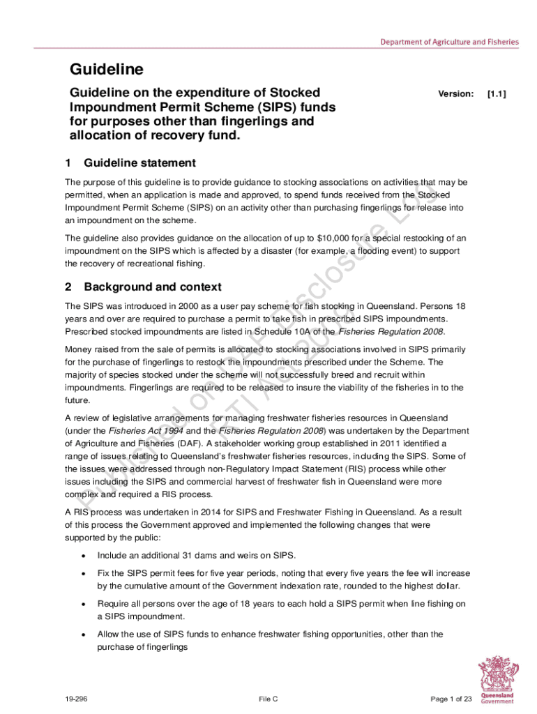 Guideline on the expenditure of Stocked Impoundment Permit Scheme (SIPS) funds for purposes other than fingerlings and allocation of recovery fund. 1Version:Guideline statementgThe purpose of this