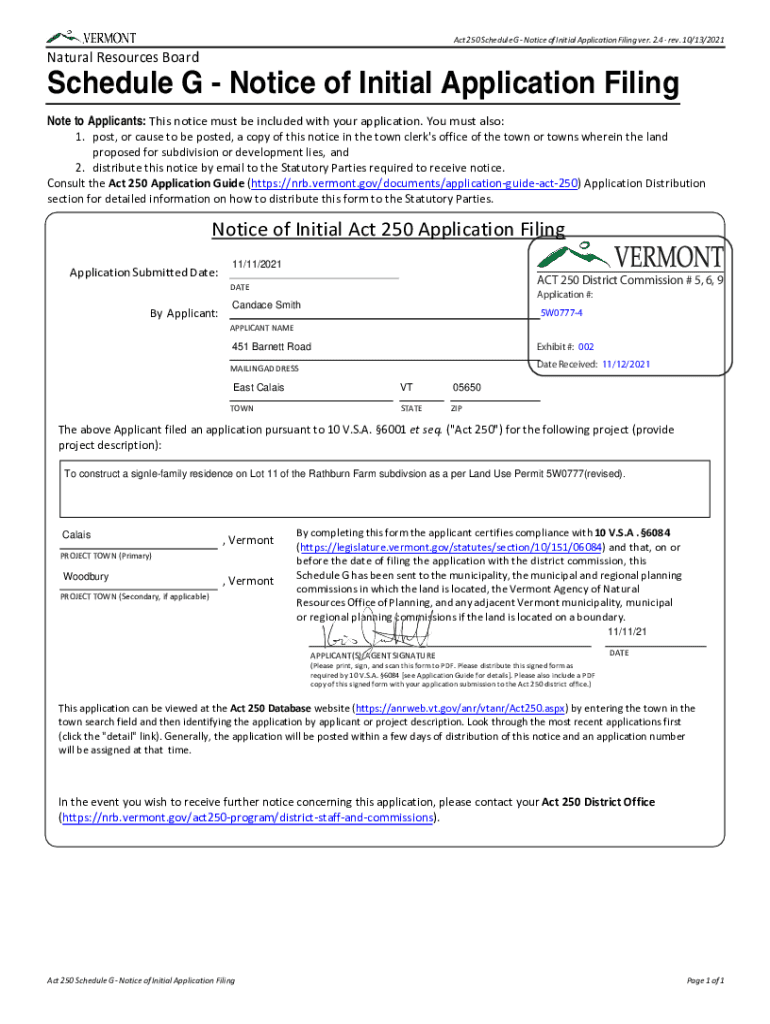 Act 250 Schedule G Notice of Initial Application Filing very. 2.4 rev. 10/13/2021Natural Resources BoardSchedule G Notice of Initial Application Filing Note to Applicants: This notice must be included