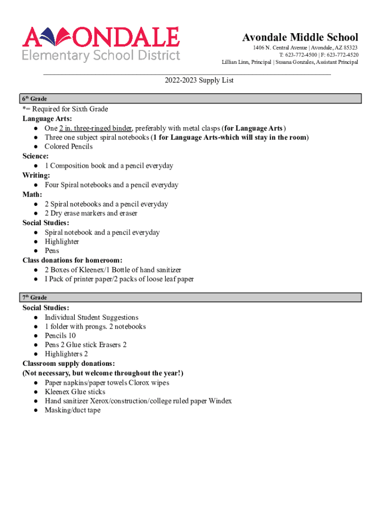 Avondale Middle School 1406 N. Central Avenue | Avondale, AZ 85323 T: 6237724500 | F: 6237724520 Lillian Line, Principal | Susana Gonzales, Assistant Principal___ 20222023 Supply List 6th Grade* Required