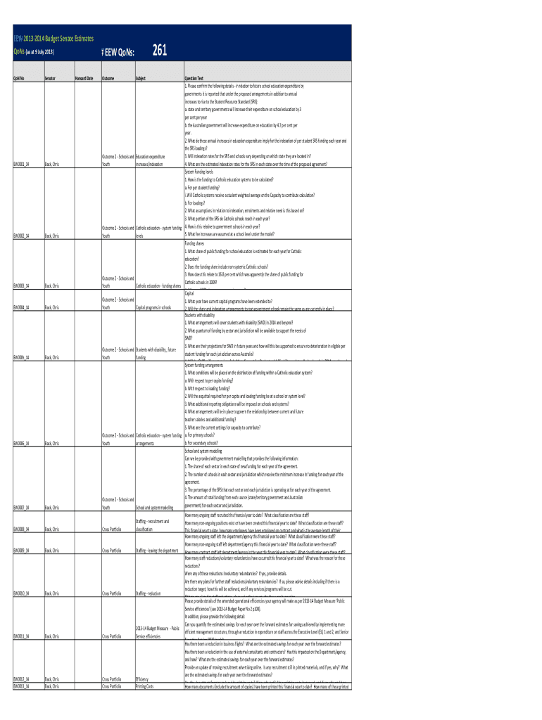 NEW 20132014 Budget Senate Estimates Sons (as at 9 July 2013) Total On NoSenatorEW0001_14Back, ChrisEW0002_14Back, ChrisHansard DateOutcomeQuestion Text 1. Please confirm the following details in