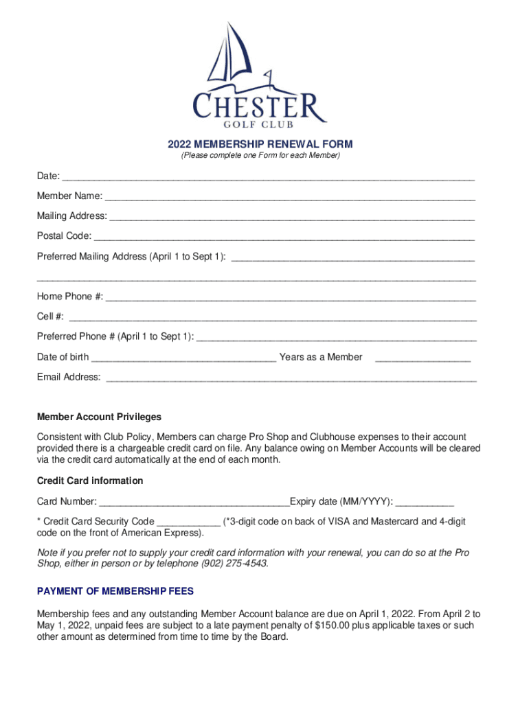 2022 MEMBERSHIP RENEWAL FORM (Please complete one Form for each Member)Date: ___ Member Name: ___ Mailing Address: ___ Postal Code: ___ Preferred Mailing Address (April 1 to Sept 1): ___ ___ Home