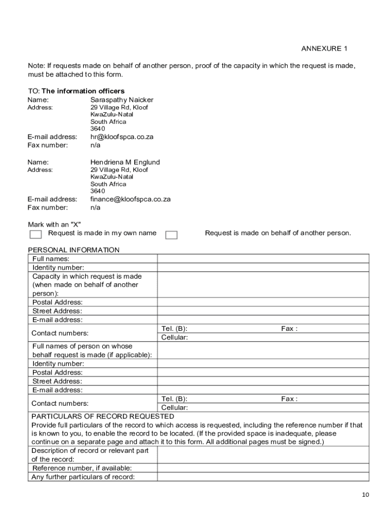 PROMOTION OF ACCESS TO INFORMATION ACT SECTION 51 MANUALKLOOF & HIGHWAY SPCA1TABLE OF CONTENTSPageIntroduction3Definitions3Overview of The NPO31. Contact details of the Information Officers42. Guide
