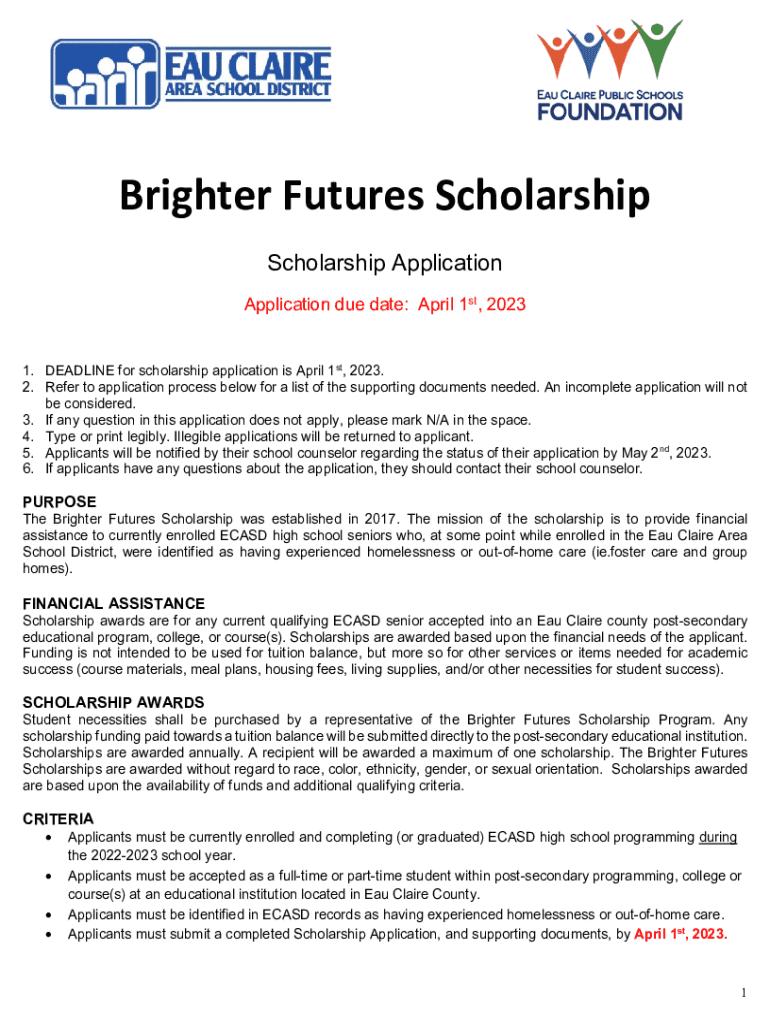 Brighter Futures Scholarship Application due date: April 1st, 2023 1. DEADLINE for scholarship application is April 1st, 2023. 2. Refer to application process below for a list of the supporting documents