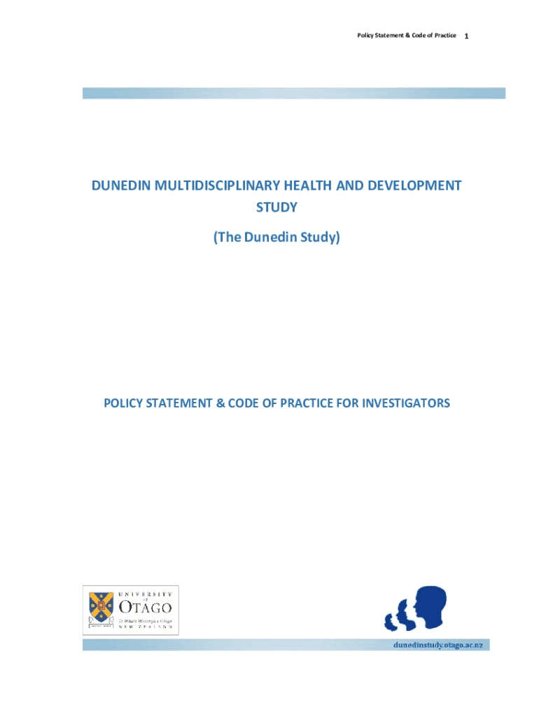 PolicyStatement&CodeofPractice1 DUNEDINMULTIDISCIPLINARYHEALTHANDDEVELOPMENT STUDY (TheDunedinStudy) POLICYSTATEMENT&CODEOFPRACTICEFORINVESTIGATORS PolicyStatement&CodeofPracticeTABLEOFCONTENTS INTRODUCTION.3