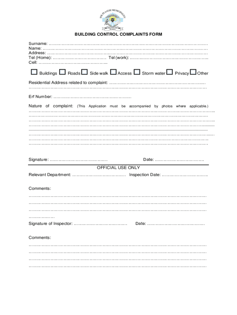 BUILDING CONTROL COMPLAINTS FORM Surname:. Name: Address: Tel (Home):. Tel (work):.